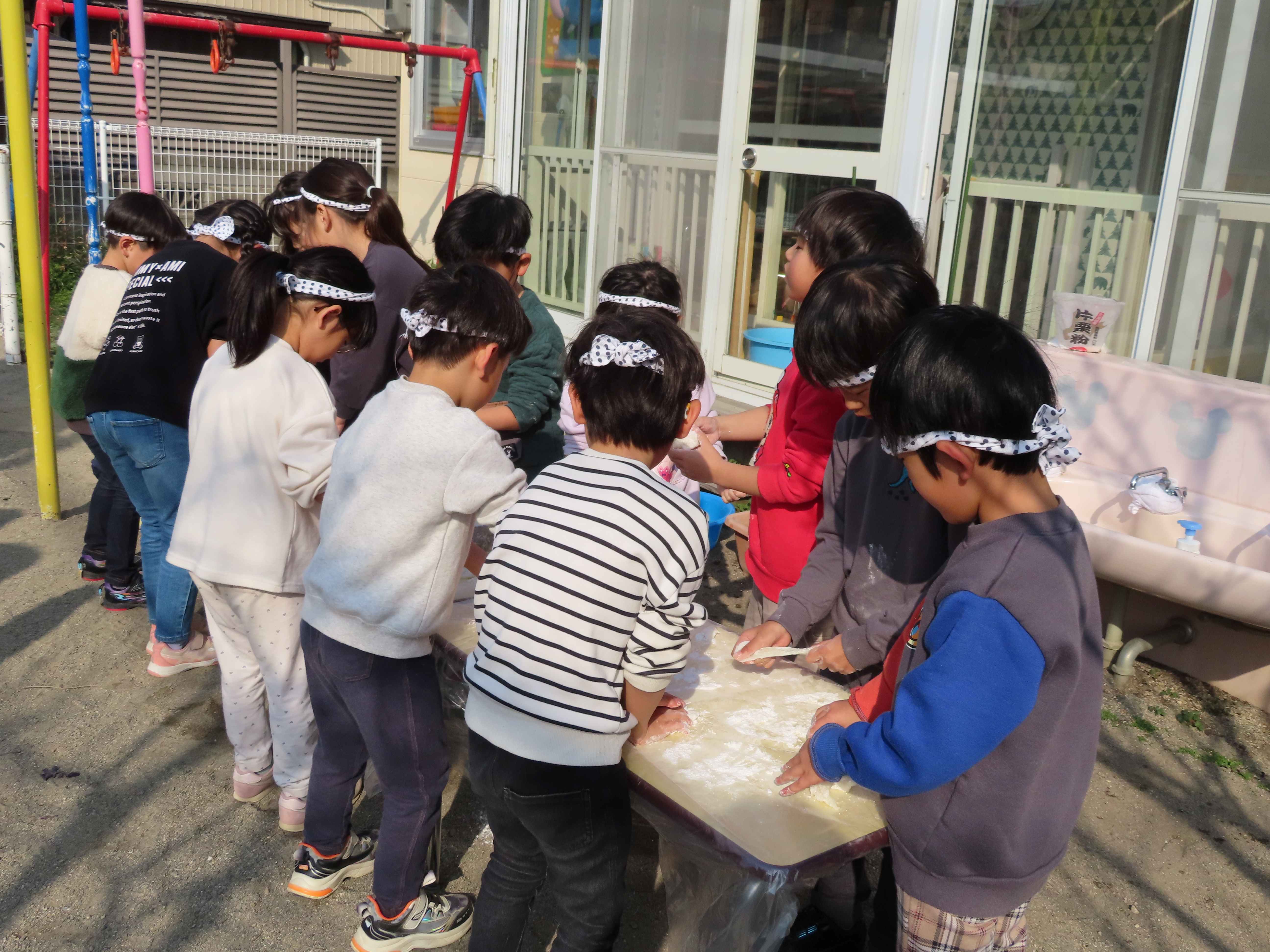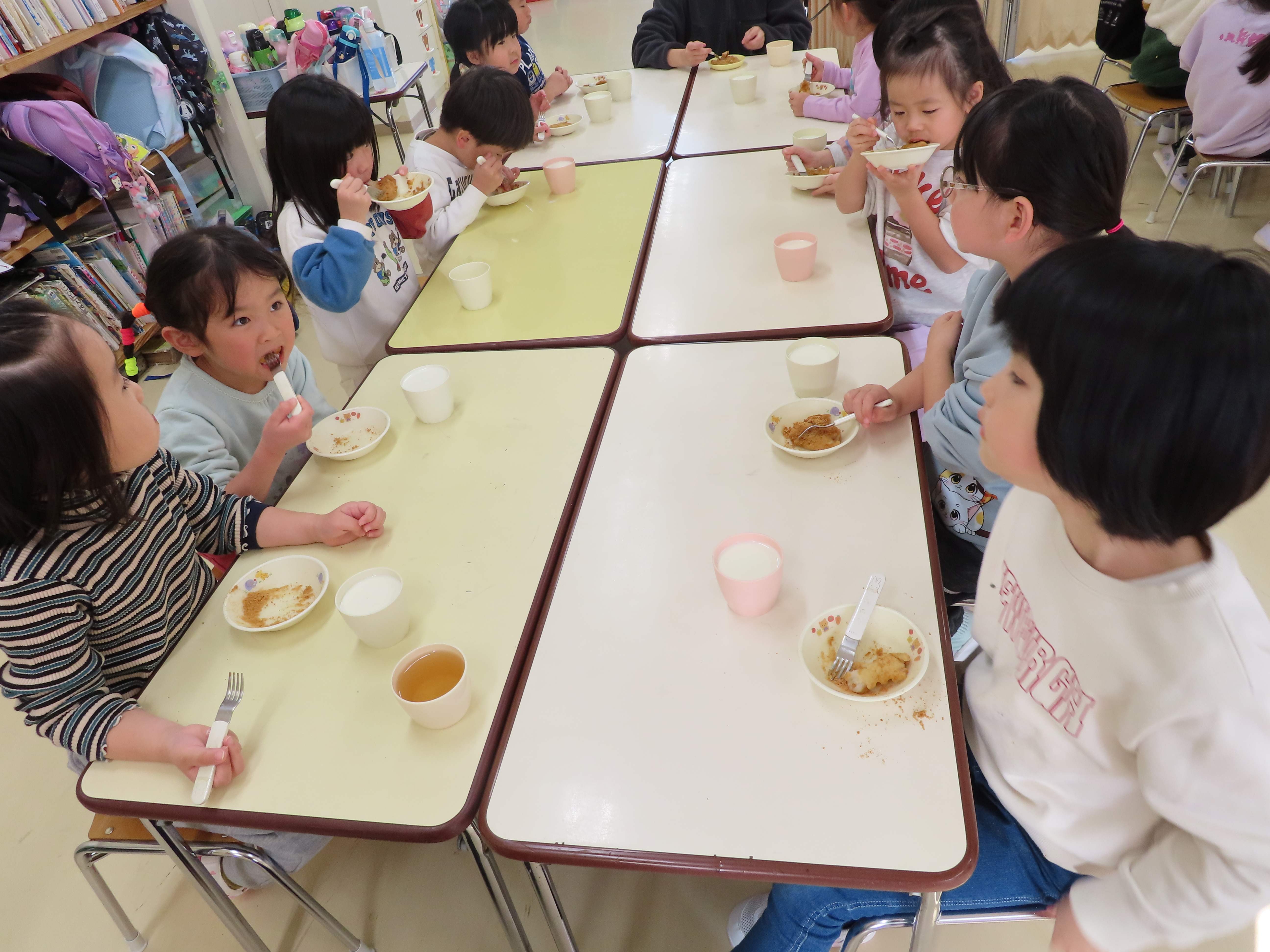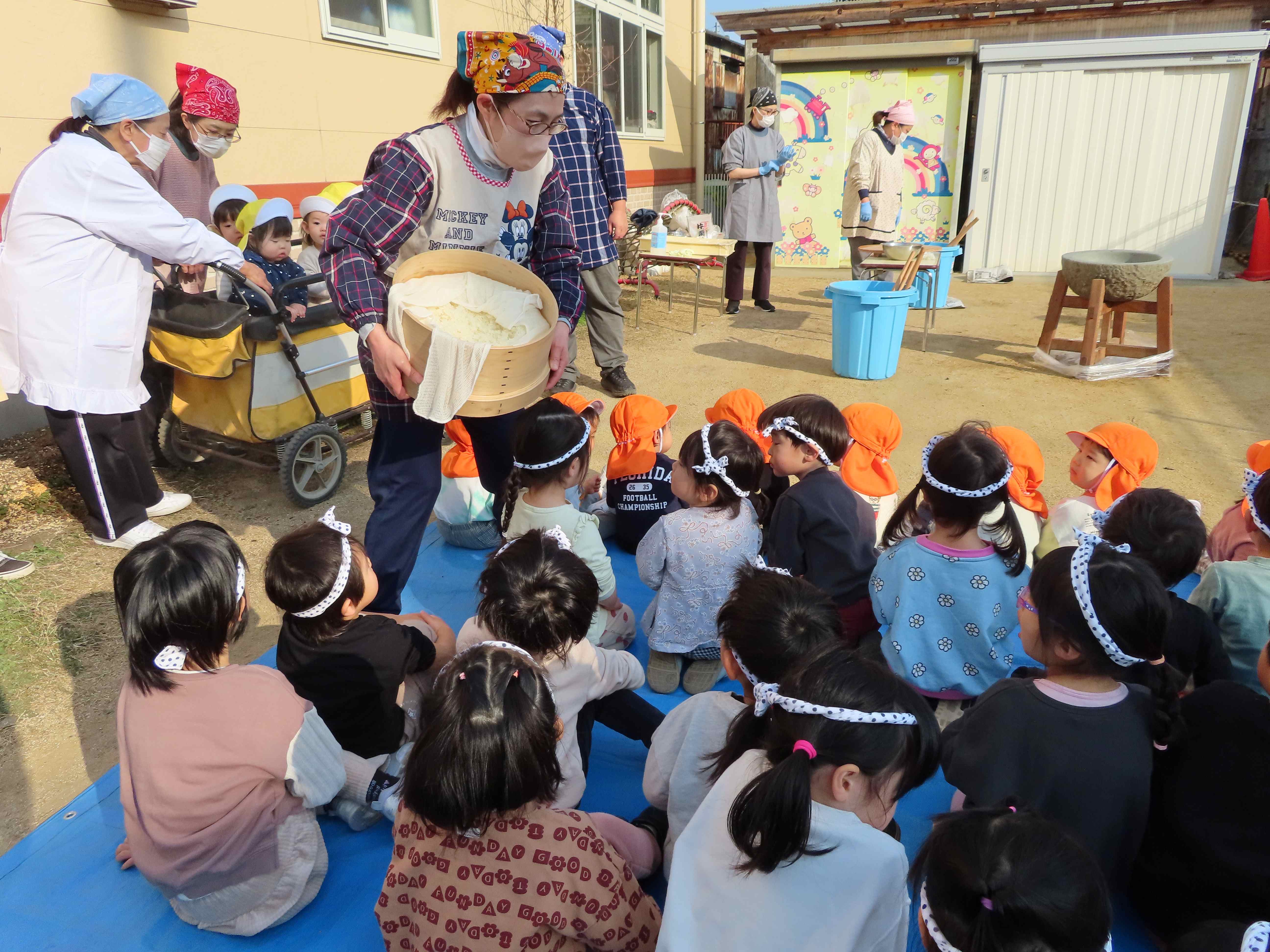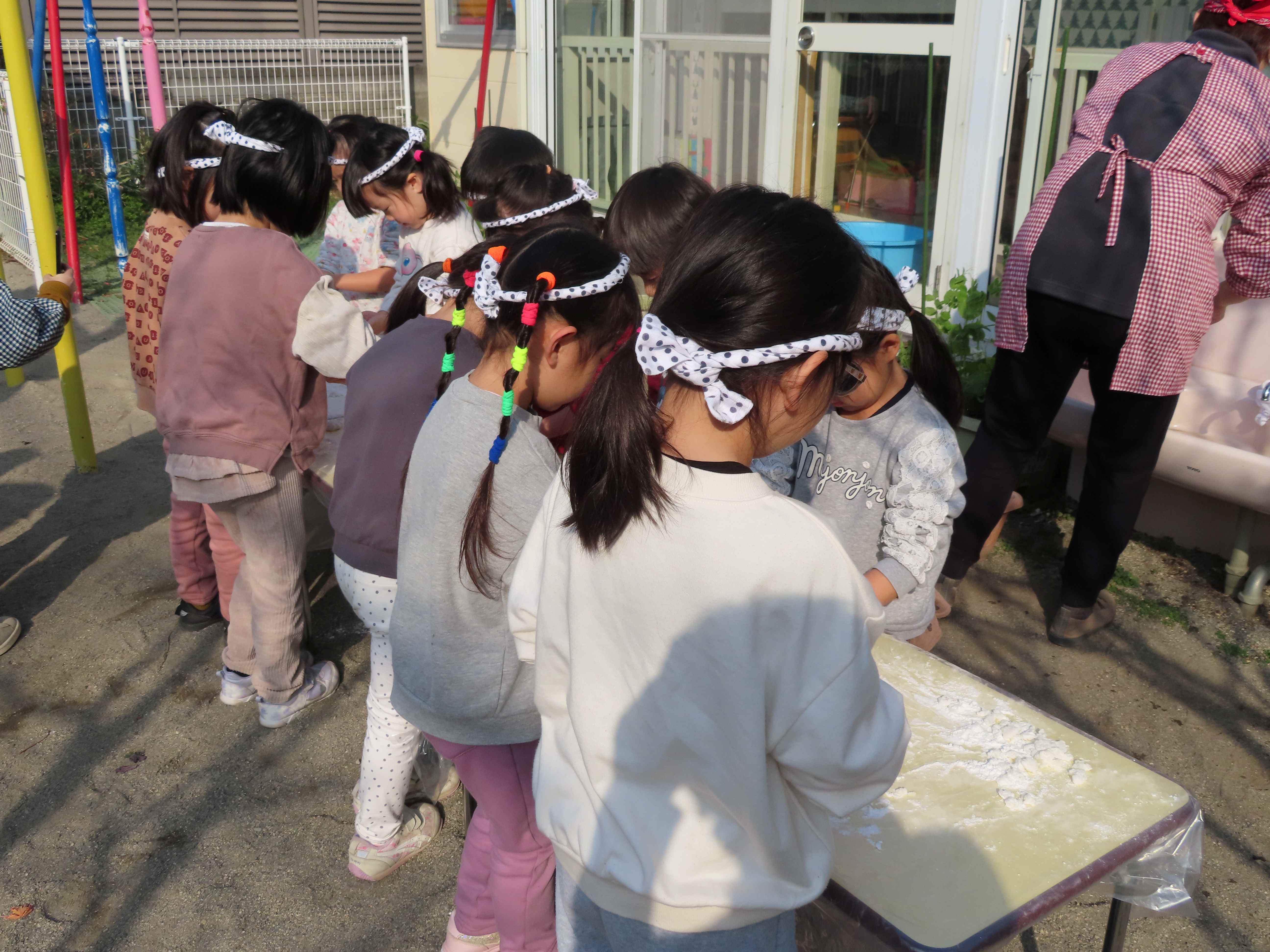 ぱんだ・ぞう組は先生たちがついたおもちをあべ川もちにして食べました。おいしかったね!