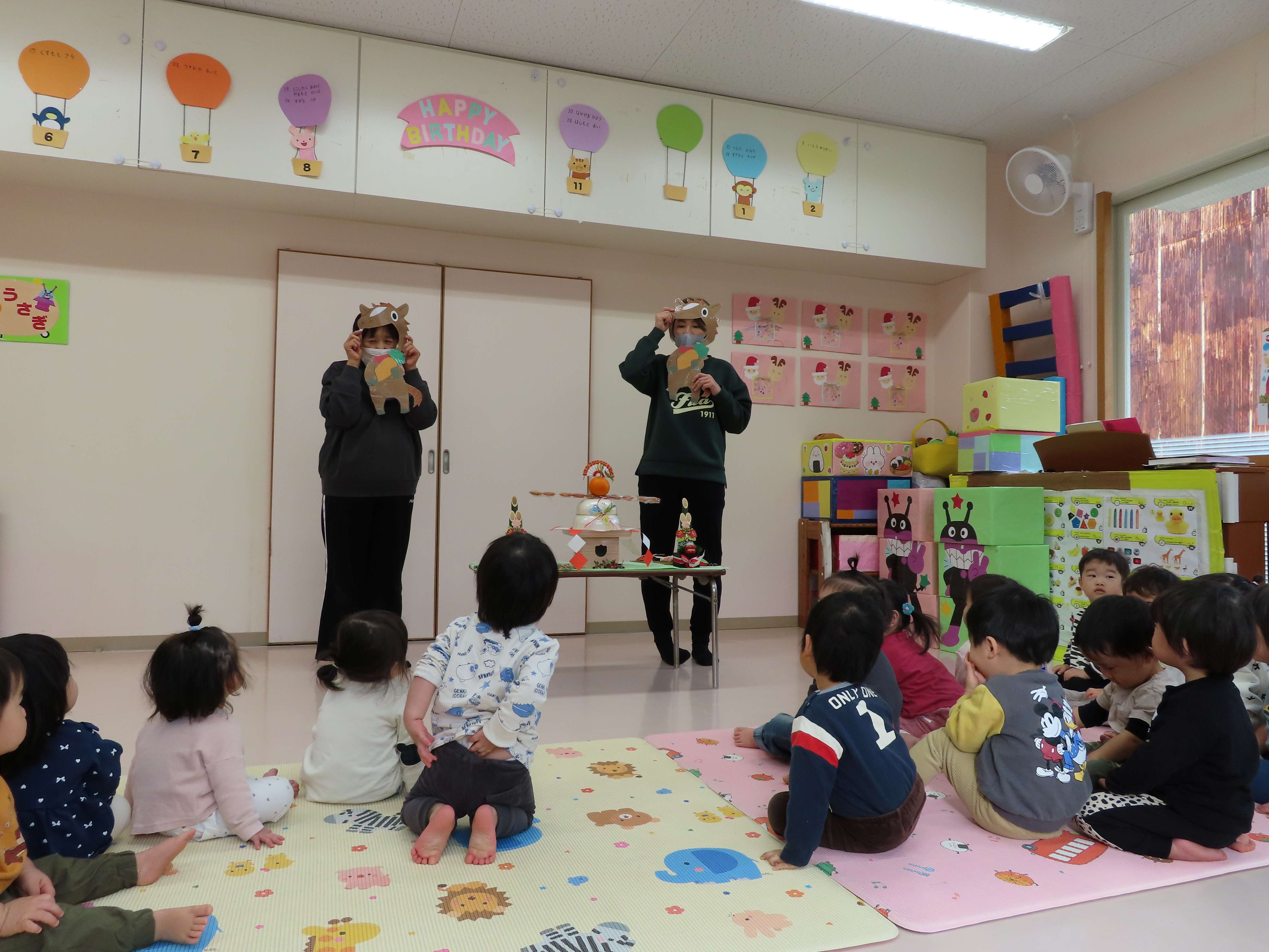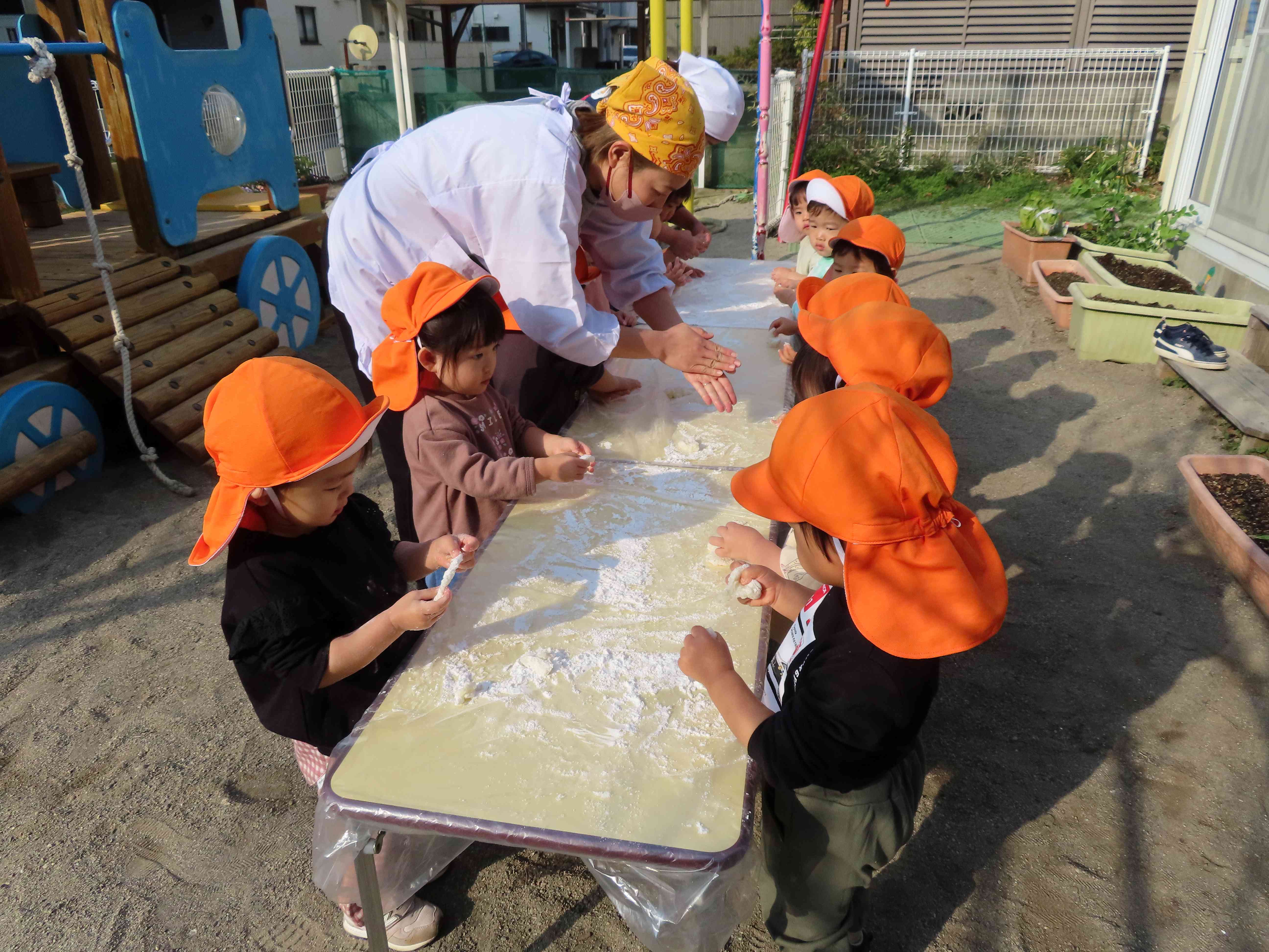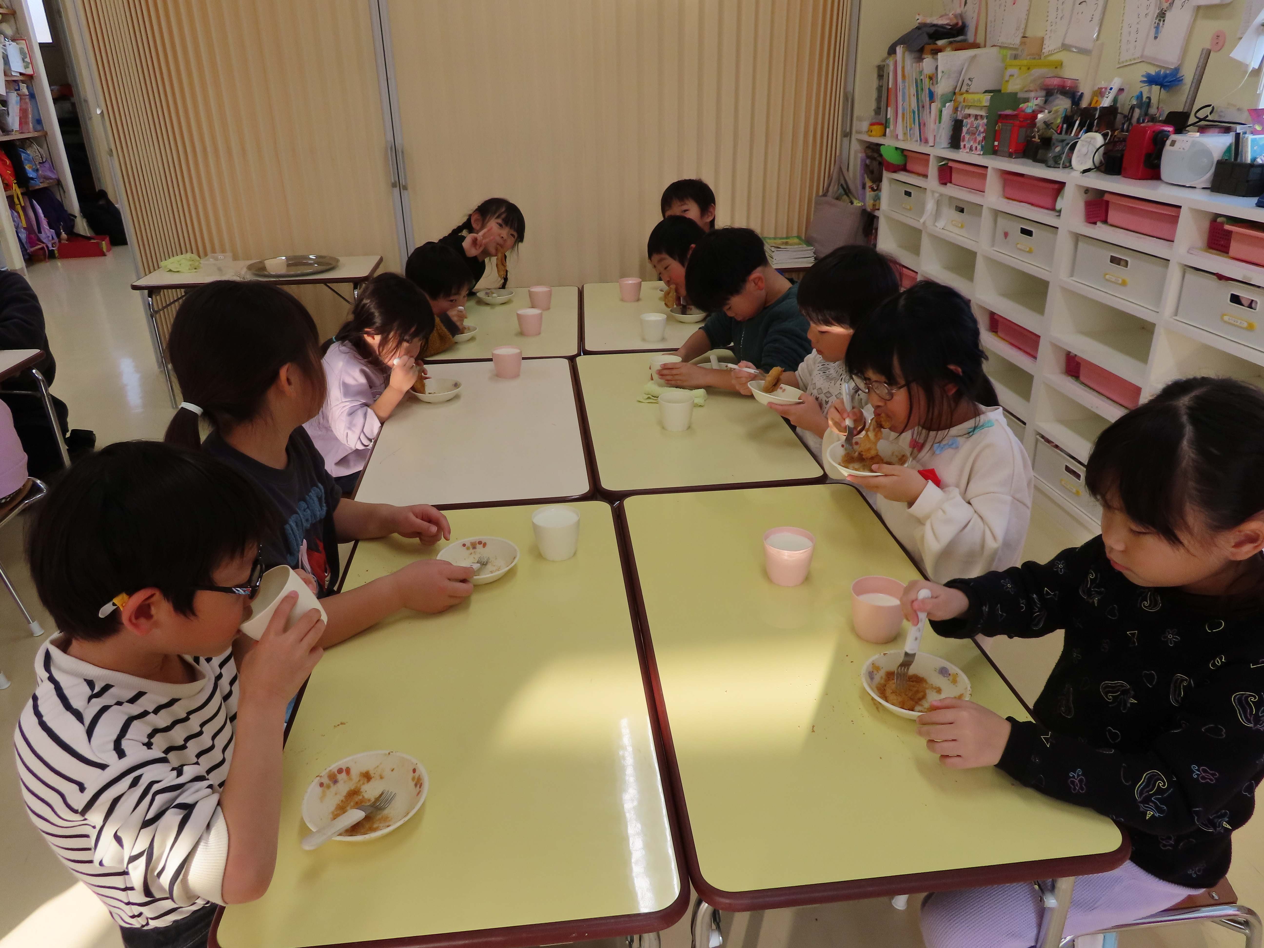 ぱんだ・ぞう組は先生たちがついたおもちをあべ川もちにして食べました。おいしかったね!