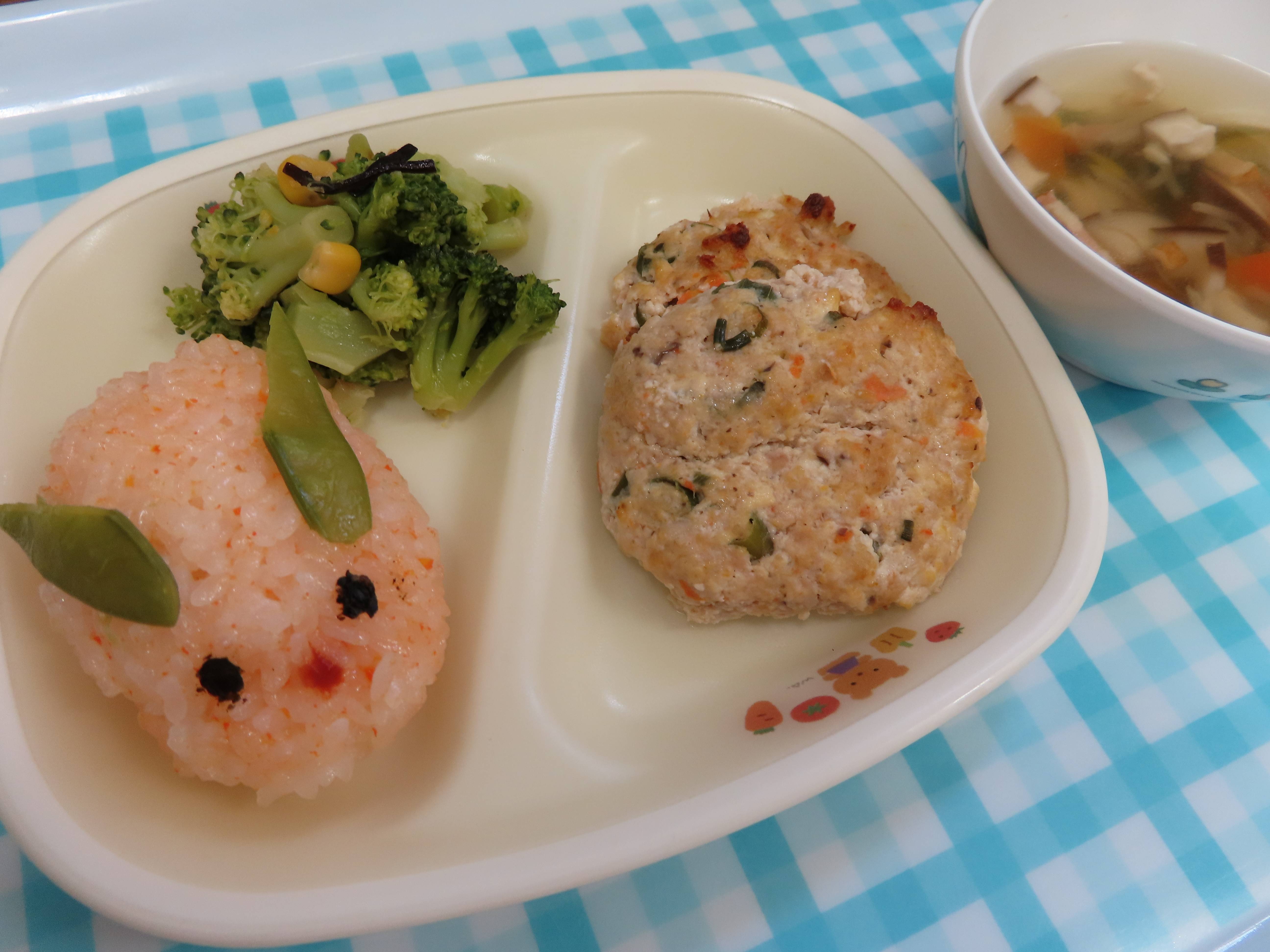 おにぎり ブロッコリー 和風ハンバーグ わかめスープ